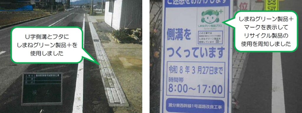 出雲市も、道路や水路の改良工事に「しまねグリーン製品+(プラス)」を使用することにより、再資源化・減量化を推進しています。