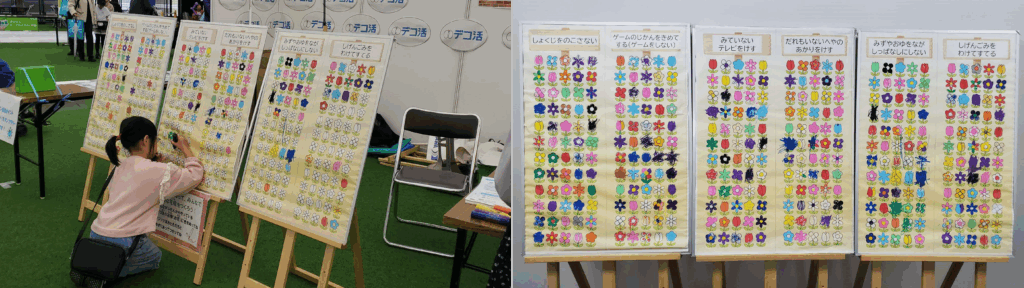 ※ デコ活の取組が記載された花壇の絵の中から、日頃から行っている取組が記載された花壇に咲いている花に色を塗ってもらう企画です。