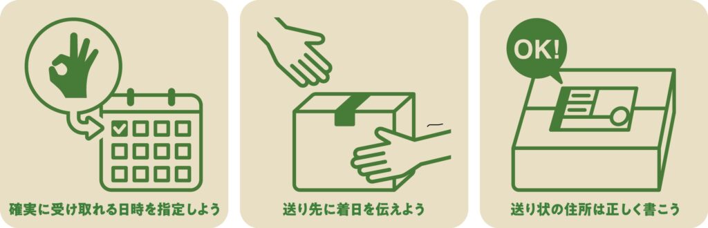 また、誤配達を防ぐために、送り先の住所は正しく分かりやすく書きましょう。